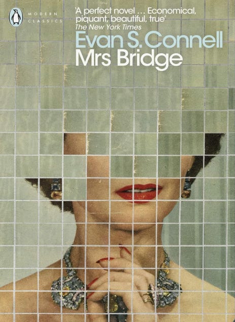 Connell was 35 when Mrs. Bridge was published, which is a bit of a depressing thing to consider. That’s because the novel displays an understanding of the inherent pain of life, without, in this case, much in the way of the many leavening moments that make the thing worth the effort. The first line of the novel is “Her first name was India — she was never able to get used to it.” It’s so impossible a name to get to that not even Connell gets used to it, rarely using “India,” and referring to her throughout as Mrs. Bridge. The reader doesn’t spend much time at all with her in her single days: there’s maybe half a paragraph of the novel gone by when we meet Walter Bridge. But curiously, and not insignificantly, Walter Bridge’s introduction is preceded by this: